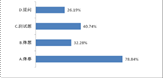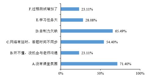 统计数据显示:线上教学的弊端ACD,没有课堂氛围、自制力欠缺、网络延迟,不同年级不同专业数据一致。