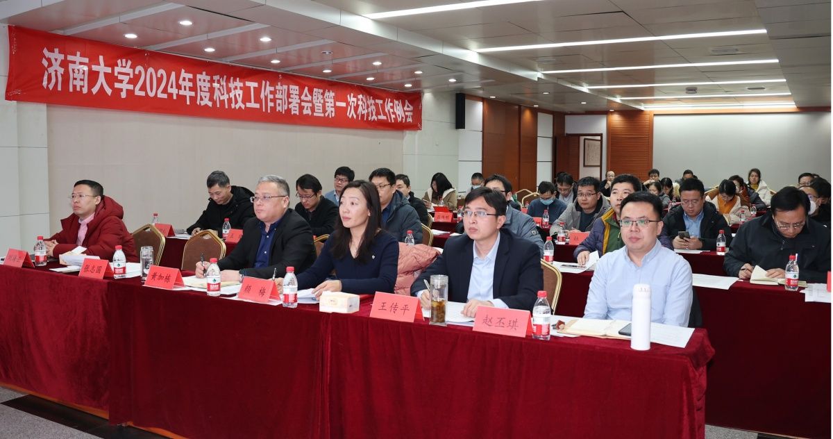 黄加栋讲话时对2024年科技工作提出五点要求:一是要正确认识我校科技工作面临的机遇和挑战。充分认识科技创新对增强我国发展竞争力和持续力、推动学校高质量发展的重要意义,深刻认识学校科技工作面临的形势和挑战,切实增强工作责任感和使命感。二是要充分发挥有组织科研对我校科技工作的推动作用。科技处要从学校层面对年度重点科技工作进行有组织的谋划、发动和实施,各学院(平台)要在具体的工作中为老师们提供有组织的服务,协同发力进一步提高有组织科研的能力和水平,营造浓厚的科技创新氛围。三是要努力提高对外交流的积极性和主动性。进一步发扬我校科技工作逢旗必夺的气势和精神,主动走出去,加强与上级部门、同行、行业和企业的交流,千方百计扩大学校的学术影响力。四是要全力抓好标志性重大重点科技工作产出。要加大标志性重大重点科技工作培育力度,重点抓好大项目、大成果、大转化、大平台的产出,做到精准服务、贴身服务。五是要扎实做好各项科技指标落实落地。一分部署九分落实,要注重科技服务工作的贡献度,发扬济大精神,以时时放心不下的责任感和不折不扣抓落实、雷厉风行抓落实、求真务实抓落实、敢做善为抓落实的良好精神状态,确保新学期及2024年各项科技指标顺利完成。