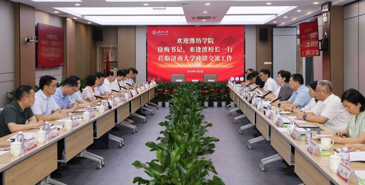 刘春华对徐梅、来逢波一行表示热烈欢迎,介绍了济南大学在党建引领、学科建设、人才培养、科学研究、师资队伍、社会服务等方面的情况和学校近年来取得的成绩。她表示,潍坊学院办学特色鲜明,各方面工作取得了丰硕成果。希望双方加强合作,携手并进,共同担当起推动高等教育高质量发展的重任。