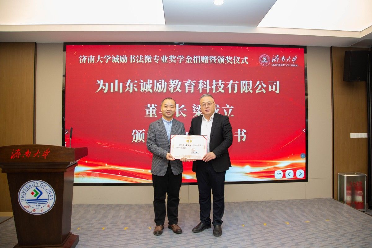 山东诚励教育科技有限公司捐资20万元设立的诚励书法微专业奖学金,是我校设立的首个微专业奖学金,体现了企业对教育事业发展的高度重视,彰显了企业强烈的社会责任感,为校企双方未来的深度合作奠定了坚实基础。首批书法微专业奖学金共有9名优秀学子获得资助。