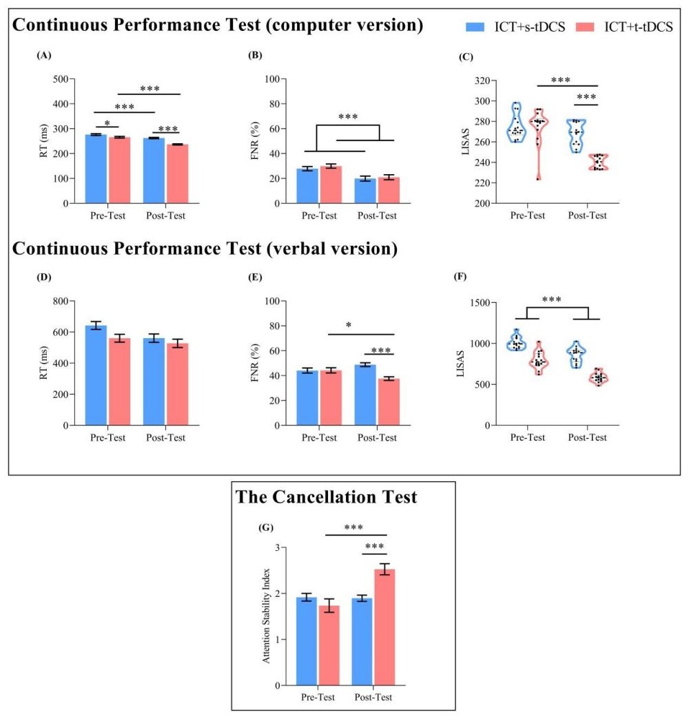 图2 电脑版和口头版Continuous Performance Test前测和后测的反应时、漏报率和线性综合速度-准确度评分(图A-F);