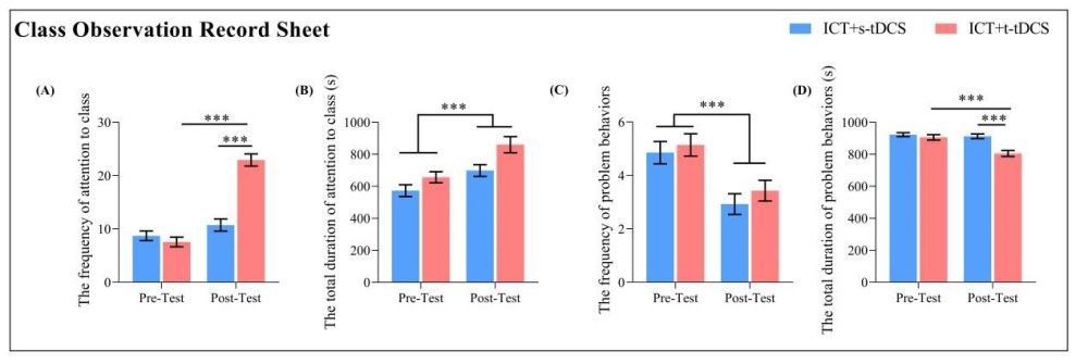 研究团队利用Go/No-go任务训练被试的反应抑制能力。将28名孤独症儿童随机分配至接受真tDCS刺激组和伪tDCS刺激组,tDCS刺激与抑制控制训练任务同时进行。分别在干预前后对被试的反应抑制能力(Dog/Monkey Task)、干扰控制能力(Day/Night Stroop Task,近迁移)、持续注意力(Continuous Performance Test和Cancellation Test,远迁移)、在课堂上和日常生活中抑制控制能力和持续注意力的表现进行评估,并利用功能性近红外技术(fNIRS)对任务态的前额叶皮层(PFC)的神经活动进行了测量。结果发现,抑制控制训练任务联合真tDCS刺激组的训练效果和迁移效应显著高于伪tDCS刺激组。且训练效果和迁移效应可以推广到课堂环境中。接受抑制控制训练任务联合真tDCS刺激后,观察到双侧dLPFC和FPA中氧合血红蛋白(HbO)浓度在一致条件下的Day/Night Stroop Task和Continuous Performance Test中存在显著的变化。