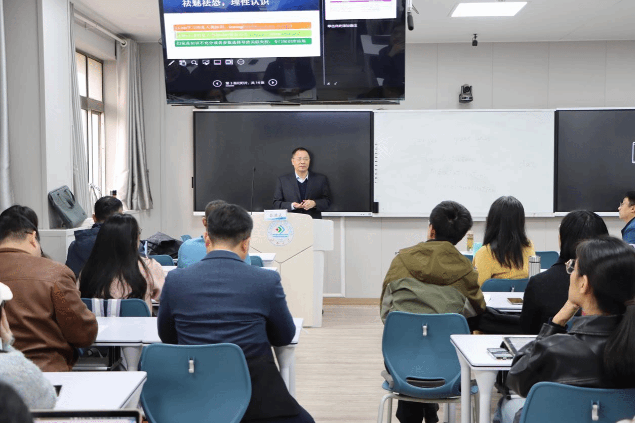 曲阜师范大学外国语学院院长、教授秦洪武以“AI赋能外语学科发展:理路和途径”为题,通过真实展示AI工具的学习、运作过程带领师生了解大语言模型的工作原理以及如何运用大语言模型赋能语言学习与教学等各方面。讲座从“祛魅祛恐,理性认识”“协同并作,提质增效”“为我所用,锐意创新”三个方面展开,具体地阐述、讲明了大语言模型是如何运作的,师生应该如何认识大语言模型、如何与之相处、如何利用它促进语言发展与教师教学等多个问题。他的讲解生动有趣,对AI工具的利用十分娴熟,现场对AI工具的演示让人印象深刻,使师生获益匪浅。