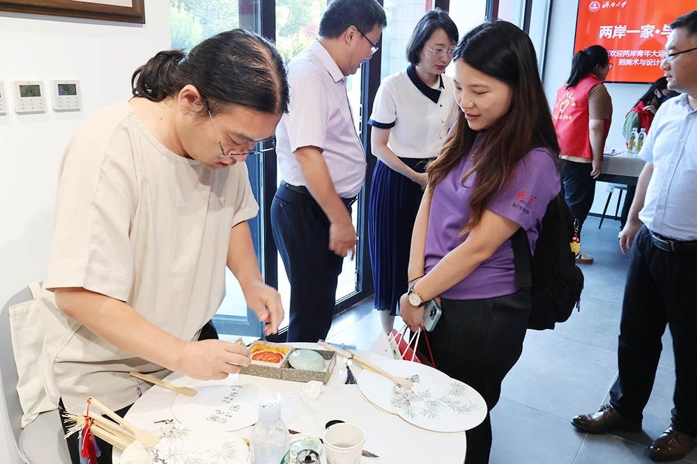 为了让台湾师生更好地感受中国传统文化的魅力,美术系王小飞老师现场绘制中国传统水墨画团扇,精湛的技艺引得师生们赞叹不已。美术系丁奕翔老师精心设计的漆面扇体验项目,也让同学们跃跃欲试。书法系成海明博士在书法专业教室指导台湾青年学生体验中国传统书法艺术,同学们一笔一划认真书写了“两岸一家 与你同行”主题作品,在笔墨之间感受着两岸同根同源的文化底蕴。