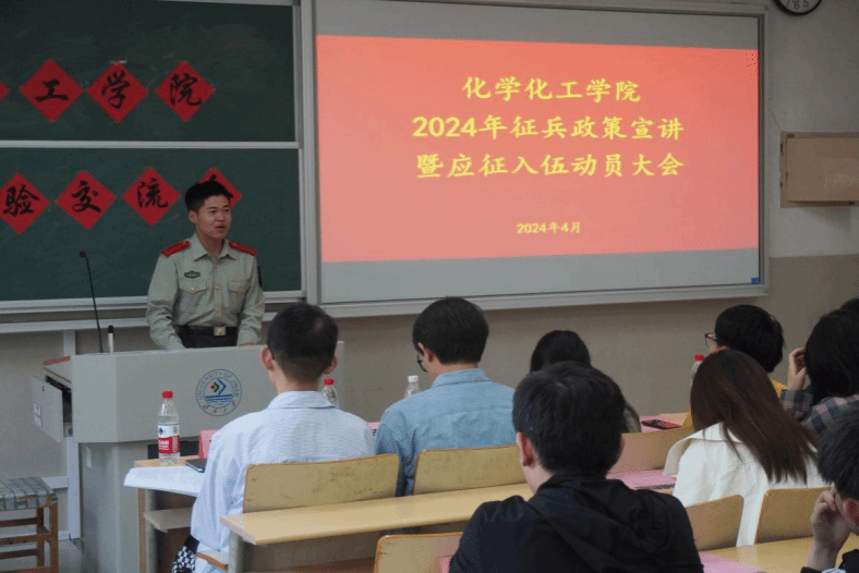 为贯彻落实国家征兵政策,扩大征兵政策宣传的影响力和辐射面,进一步鼓励和引导大学生应征入伍,4月16日和18日,化学化工学院组织召开“志存高远砺青春·建功立业强军梦”2024年征兵政策宣讲暨应征入伍动员大会。学校党委武装部人武科科长李英武,学校第4届教导大队退役大学生应化2105刘杰、材料2212颜旭、化学2302卢国琰、环工2304王镇彬担任主讲人,学院学生工作办公室相关负责老师出席此次活动。